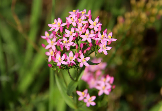 Las llamativas flores además de rosadas a veces son moradas y ocasionalmente blancas. Se agrupan en inflorescencias algo densas y cimosas. La corola es tubular y está formada por cinco hermosos pétalos. Florecen desde abril-mayo hasta septiembre.